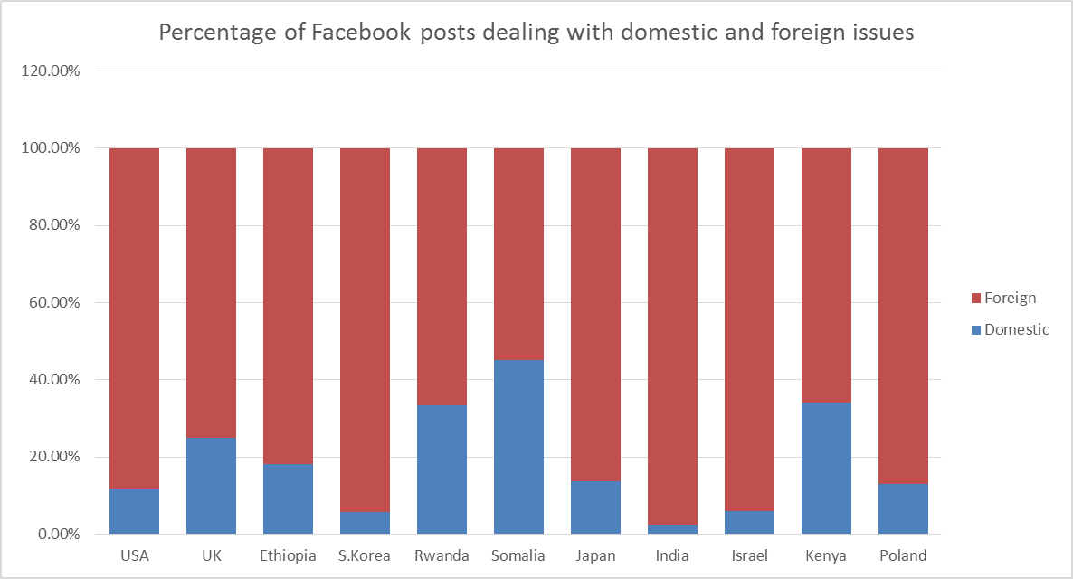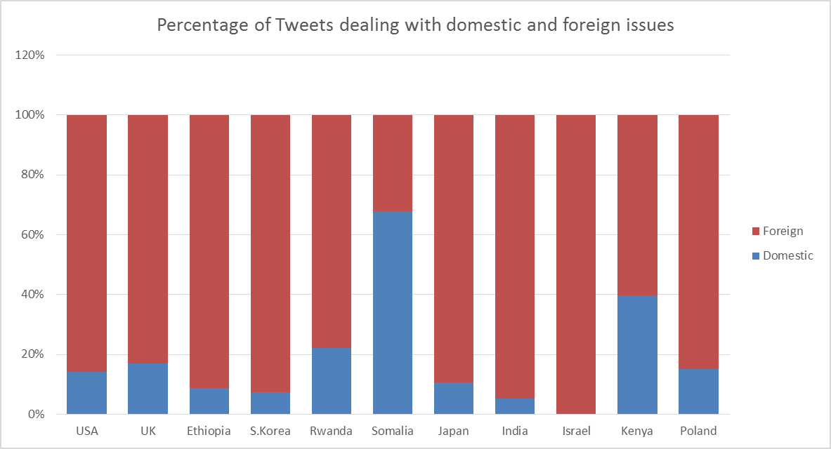 As can be seen in graph below, of all the tweets published by ministries of foreign affairs an overwhelming percentage deal with foreign issues and only a small percentage are dedicated to local ones (with the exception of Somalia)
