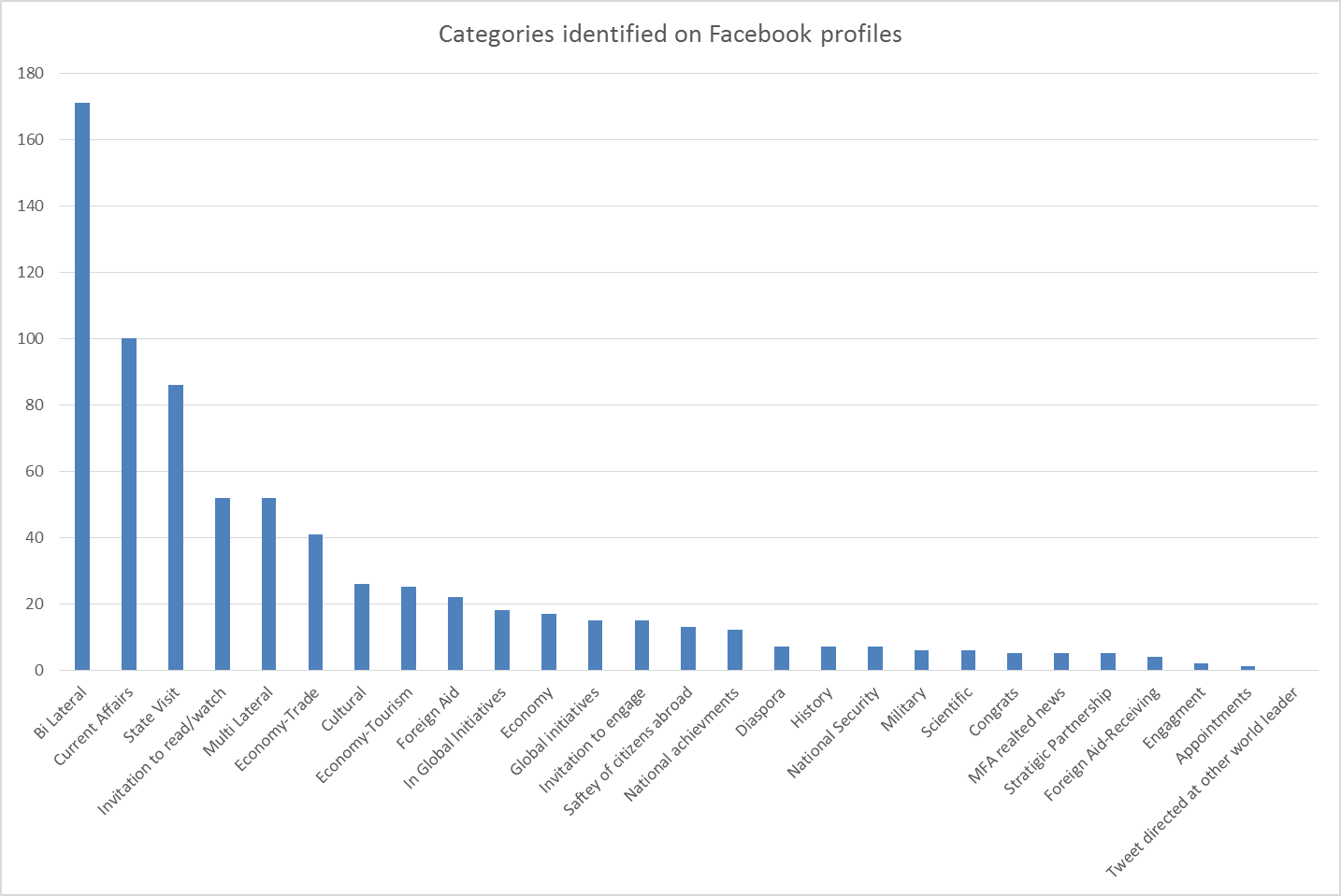Each tweet and post were categorized based on whether they dealt with local of foreign issues as a manner of examining whether they are aimed at local or international audiences. Next, each tweet and post were categorized based on their subject matter. Categories included: Economy, Trade, Tourism, Bi Lateral relations between two countries, Multi-lateral relations (e.g. European Union), Comments on current affairs (e.g., Death of Nelson Mandela), State visits and more.