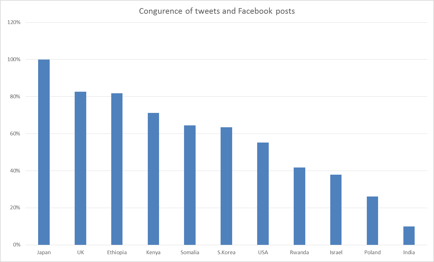 Given the similarity in topics addressed by tweets and posts alike, I conducted one final analysis- measuring the congruence between tweets and Facebook posts published by foreign ministries. I discovered that in most countries, 60% of the content published on twitter is also published in the form of Facebook posts, many times in the exact same phrasing.