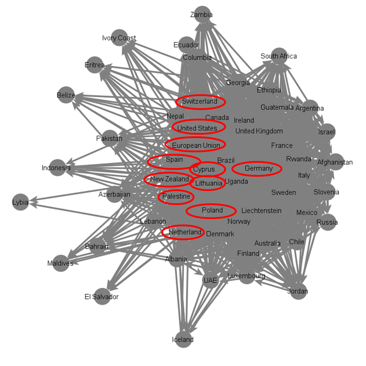 The out-degree parameter, which indicates the amount of other embassies with whom one embassy has contact, is of paramount importance. The higher an Embassy’s out-degree score the greater its ability to gather and disseminate information in the U.N’s social network. The country with the highest out-degree score is New Zealand followed by Spain, Cyprus, Palestine, the United States, the Netherlands, the European Union, Poland, Germany/Switzerland (tie) and Lithuania.