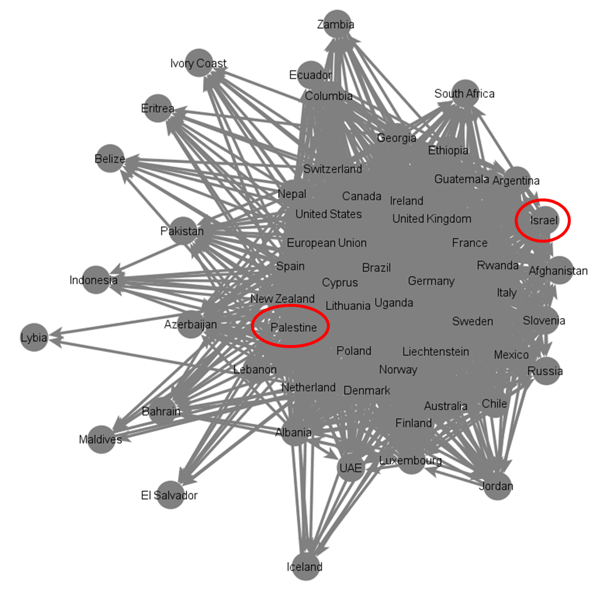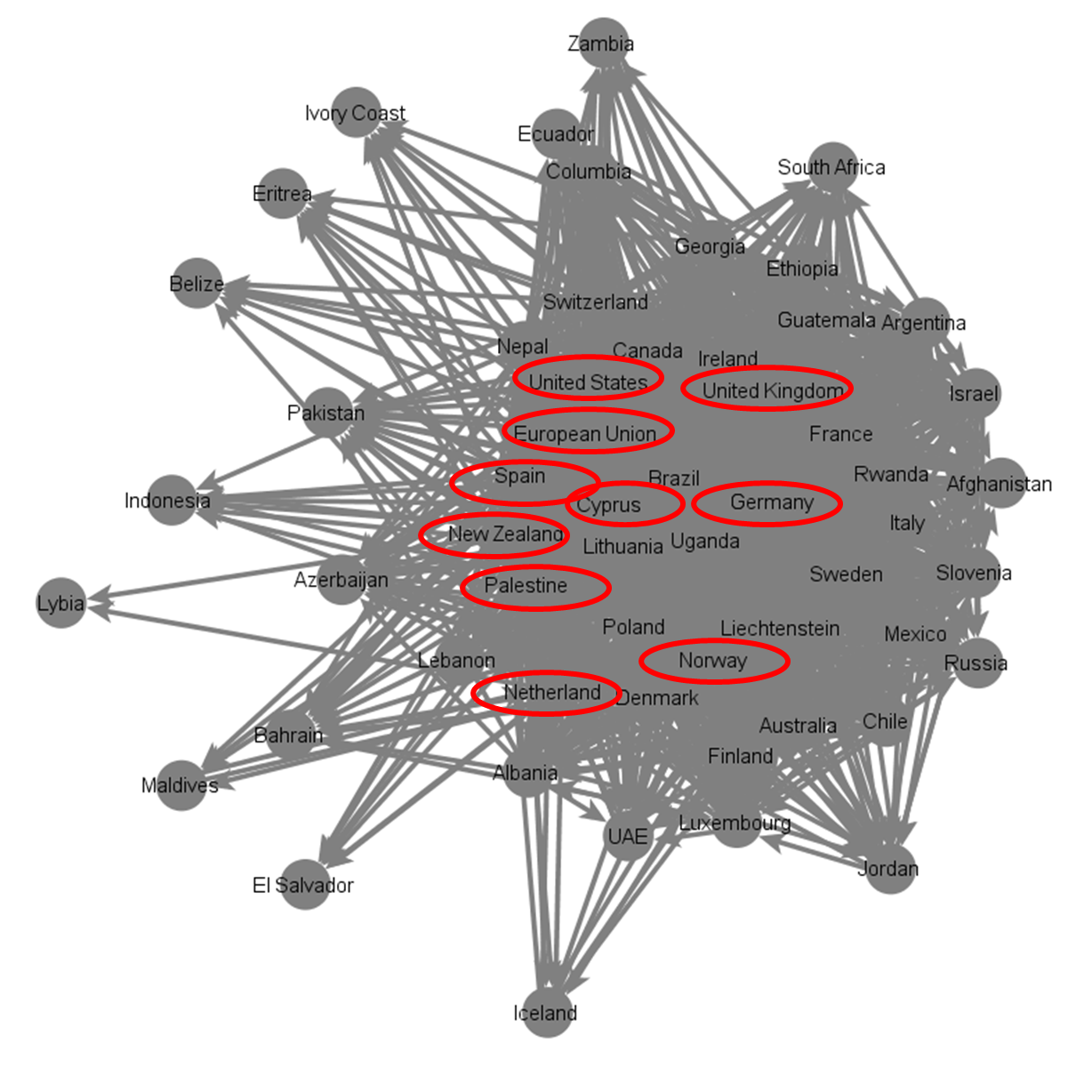 The final parameter measured was betweenness which reveals which embassies serve as important hubs of information as they link together embassies that do not follow each other directly. The embassy with highest betweenness score was the United States, followed by New Zealand, the European Union, the Netherlands, Germany, the United Kingdom, Spain, Cyprus, Palestine and Norway.