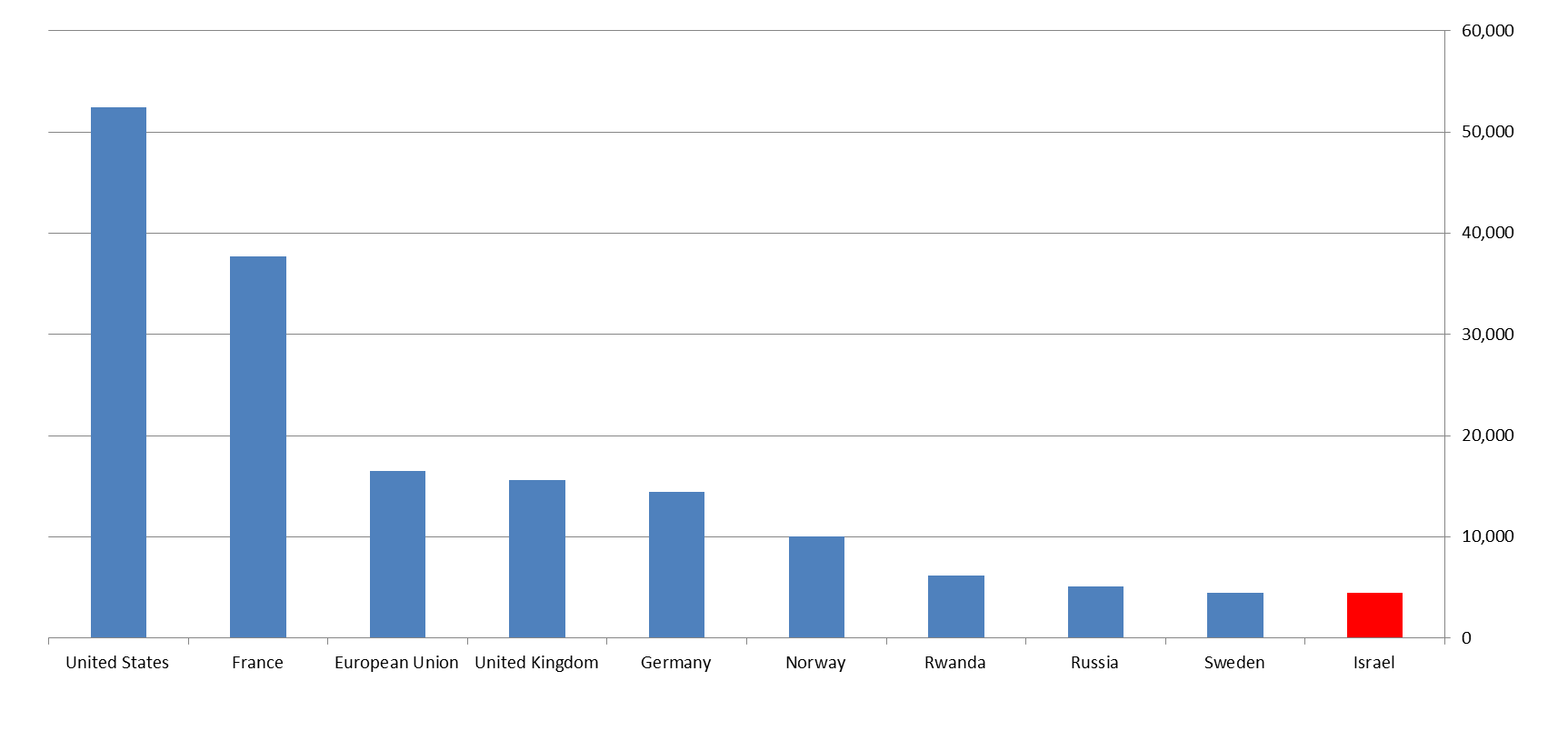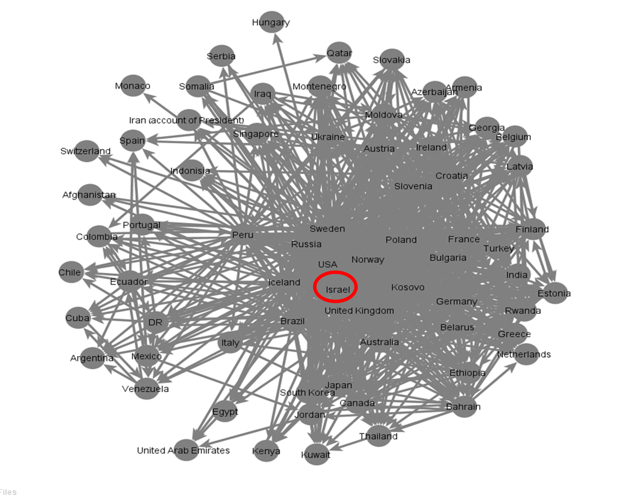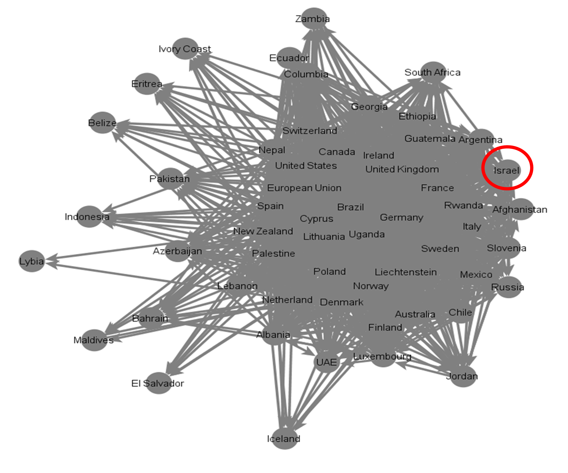 In summary, although Israel’s mission is not at the core of the UN social network, it is in a strategic position with regard to UN institutions and, more importantly, it is one of the ten most active and popular embassies to the UN.