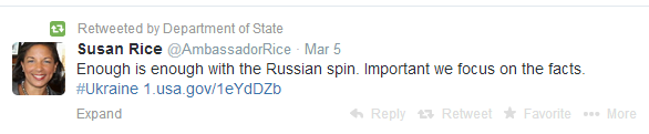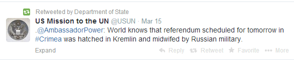 Recently, I have begun evaluating tweets published by foreign ministries during the months of January-March during which the Crimean referendum took place in Ukraine. I found that at times twiplomacy messages are very clear and simple. Such was the case with the following two tweets published by the US National Security Advisor and the US Ambassador to the United Nations.