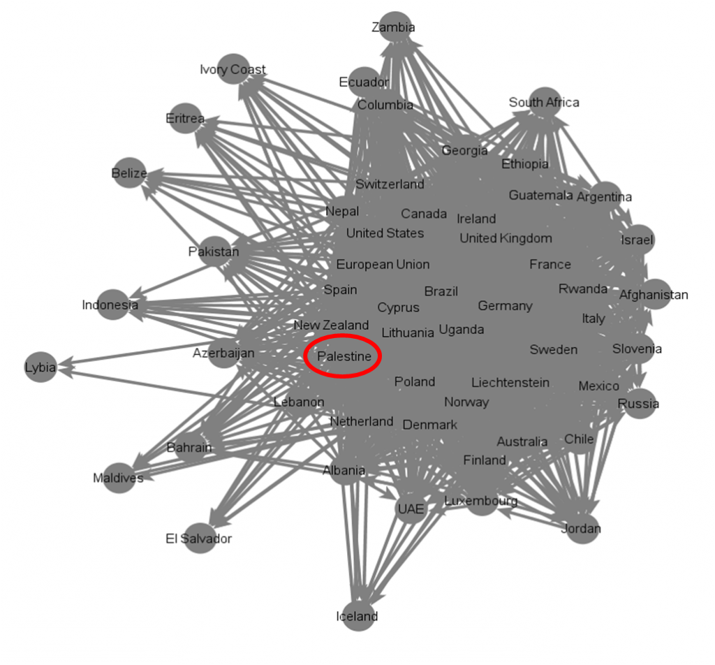 The Palestinian embassy to the United Nations is currently followed by thirty three other UN embassies making it one of the most popular members within the UN’s social network. More importantly, the Palestinian mission serves as an important hub of information within this network as many countries that do not follow one another, follow the Palestinian embassy turning into a bridge over international waters.