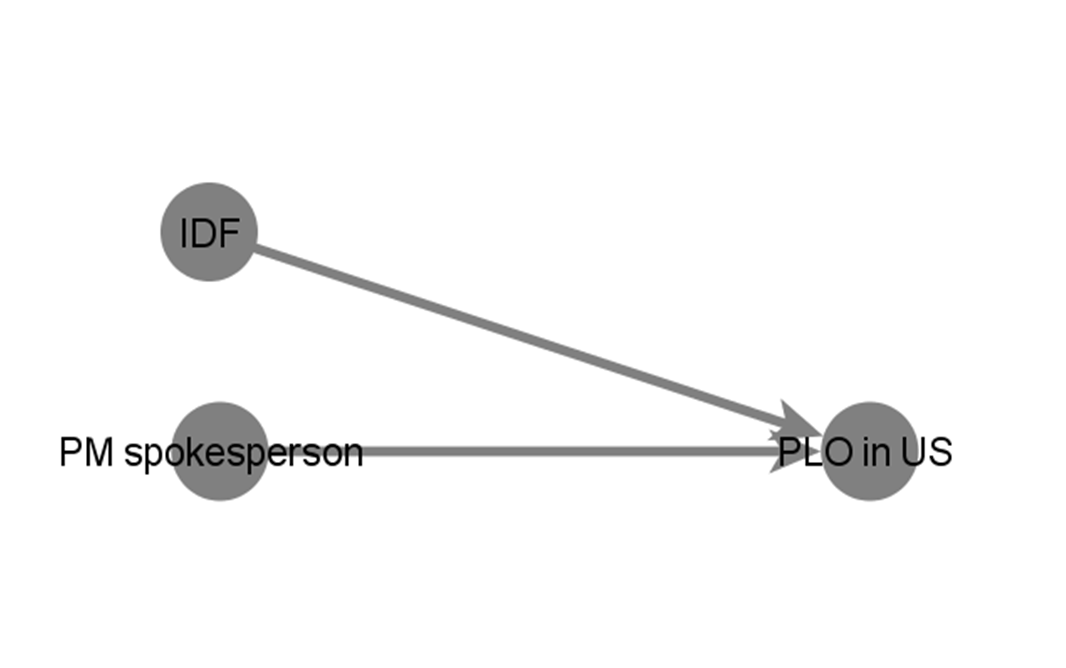 The Palestinian embassy to the US (@@PLODelegationUS) is not followed by the Israeli MFA nor by Israel’s embassy to Washington. The Palestinian embassy is followed, however, by the PM’s spokesperson for Arab Media and the official twitter account of the Israeli Defense Forces (@IDF). This decision is also most likely the result of a desire to gather relevant information from social media accounts than a political statement.