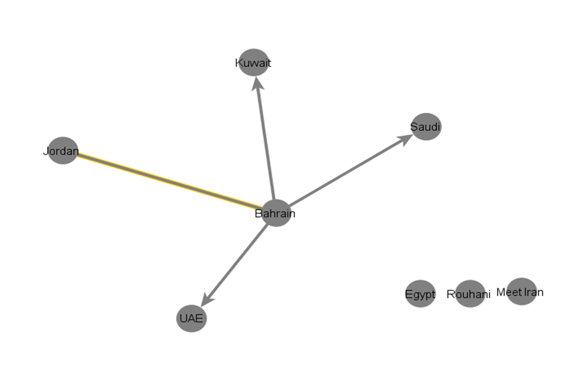 Overall, these results could indicate that Israel is more willing than Arab nations to follow social media accounts operated by its neighbors. No Arab MFA follows Israel’s MFA and only one Arab mission to the UN (Jordan) follows Israel’s mission. There are no links between the Israel’s MFA and Iranian social media accounts.