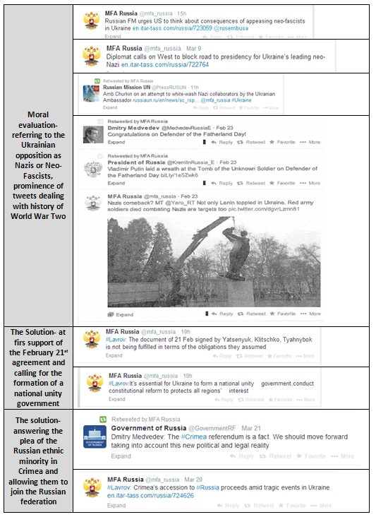 Another fascinating component of the manner in which Russia framed Germany becomes apparent when evaluating how Russia framed the Crimean crisis as a whole. According to Russia’s framing of the events, a coup d’état had taken place in Ukraine as Nazis, backed by the west, had taken control of the country placing the Russian minority in Ukraine under threat. The solution to the crisis was at first an agreement signed between President Yanukovych and the opposition and later the joining of Crimea to the Russian Federation. During the Crimean Crisis, Russia routinely referred to the perpetrators of the Coup as Nazis and published tweets dealing with the desecration of monuments to Russia’s victory in World War Two.