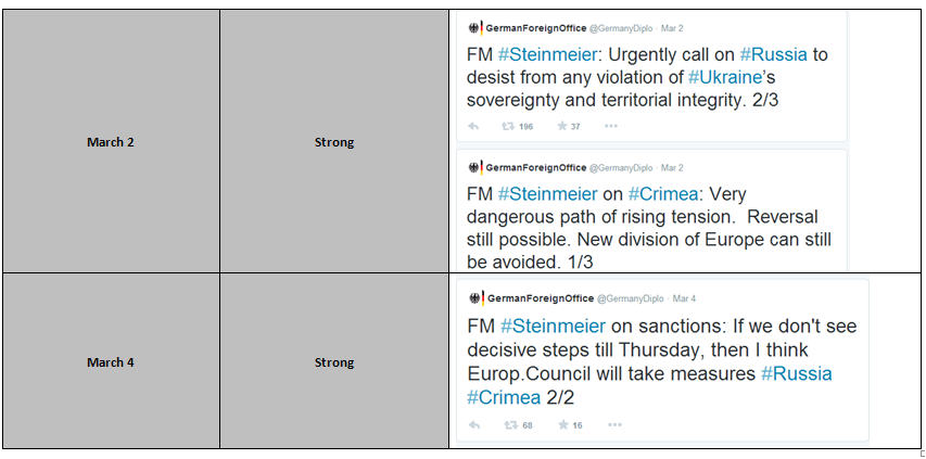 The assumption that the Russian frame impacted Germany’s response to the Crimean crisis is supported by the fact that until the beginning of March, posts tweeted by the German foreign ministry with regard to Russia had a very cooperative tone. This tone called for a diplomatic resolution to the crisis and close cooperation with Russia. This tone changed only after Russia made it clear that a referendum regarding Crimea’s acceptance to the Russian federation would take place.