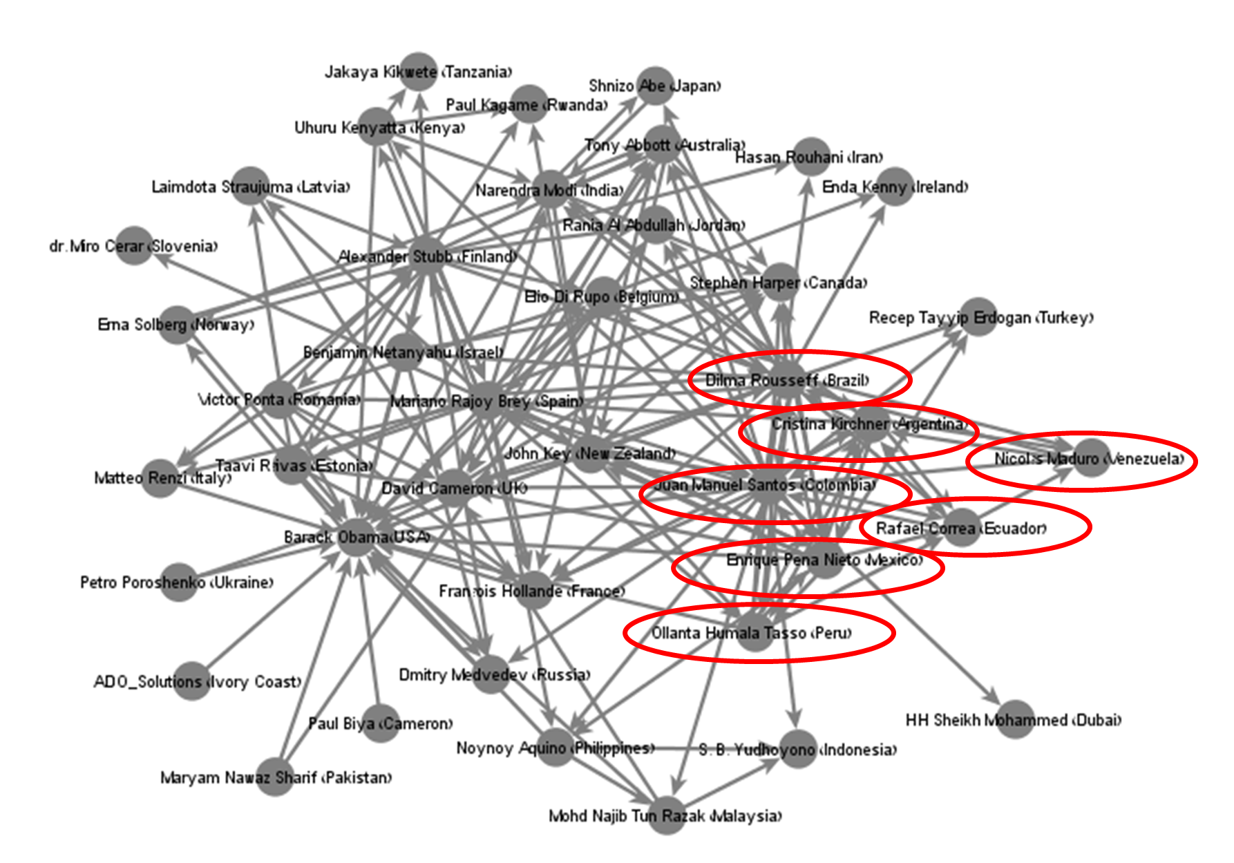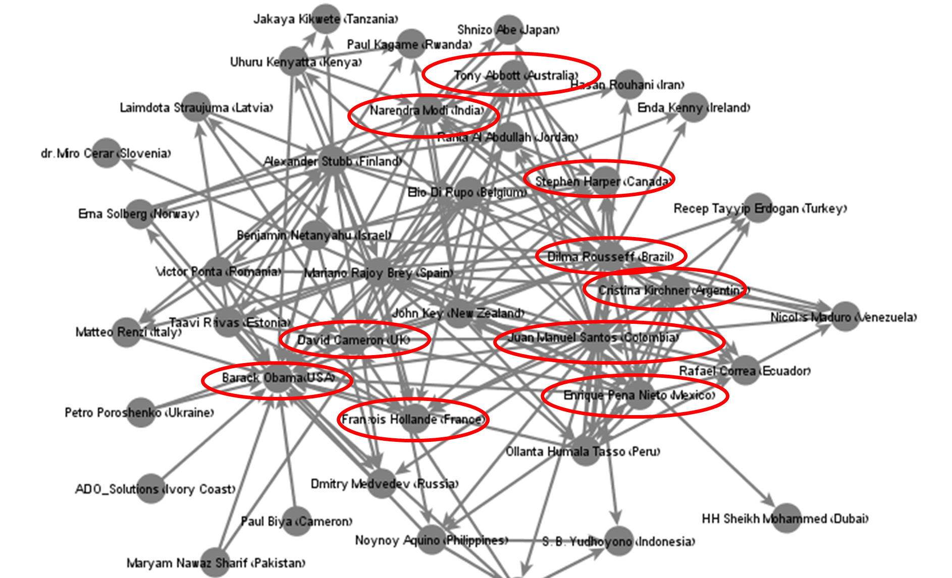 At the moment, there are only three world leaders that are highly popular, serve as important hubs of information and actively follow their peers and they are India’s PM Narendra Modi, Mexico’s Enrique Peña Nieto and Colombia’s Juan Manuel Santos. In general, this analysis finds that Latin American world leaders are more engaged in Twiplomacy than many European and Eastern European world leaders. Moreover, a country’s newsworthiness does not seem to effect its leader’s popularity among his peers. Iranaian President Rouhani, Israel’s PM Netanyahu and Ukrainian PM Poroshenko are among the least popular leaders in this network despite their country’s high profile.