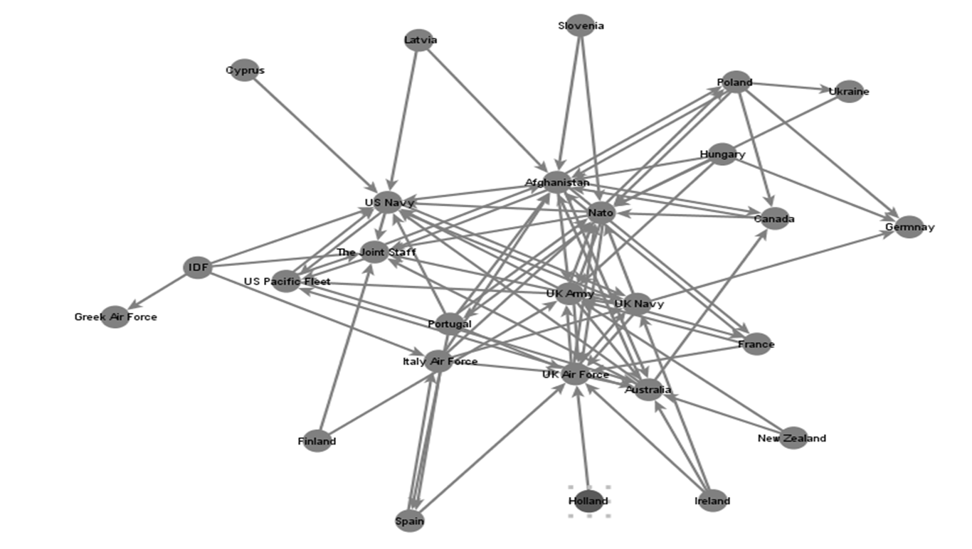 The out degree parameter, which indicates the amount of other militaries with whom one military has contact, had similar results. The military with the highest out-degree score was the British Army with Afghanistan coming in at second than NATO, Italian Air Force, Poland, UK Royal Navy, Portugal, Australia, IDF and UK Royal Air Force.