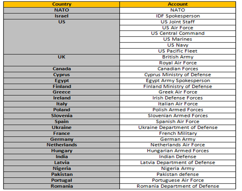 In order to answer this question, I decided to compile a sample of twitter accounts operated by militaries. The sample, consisting of 33 accounts from various nations is shown in the table below.