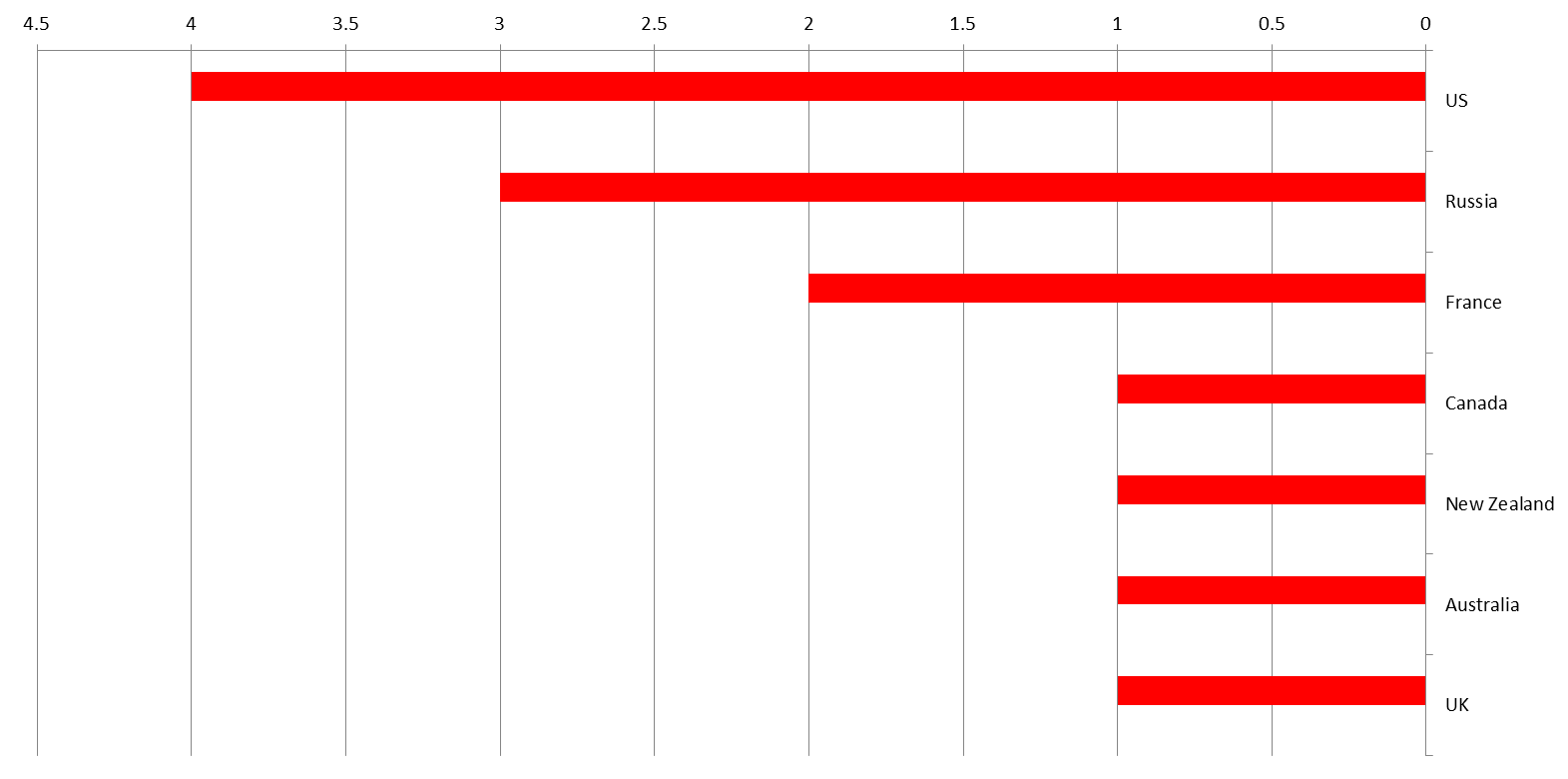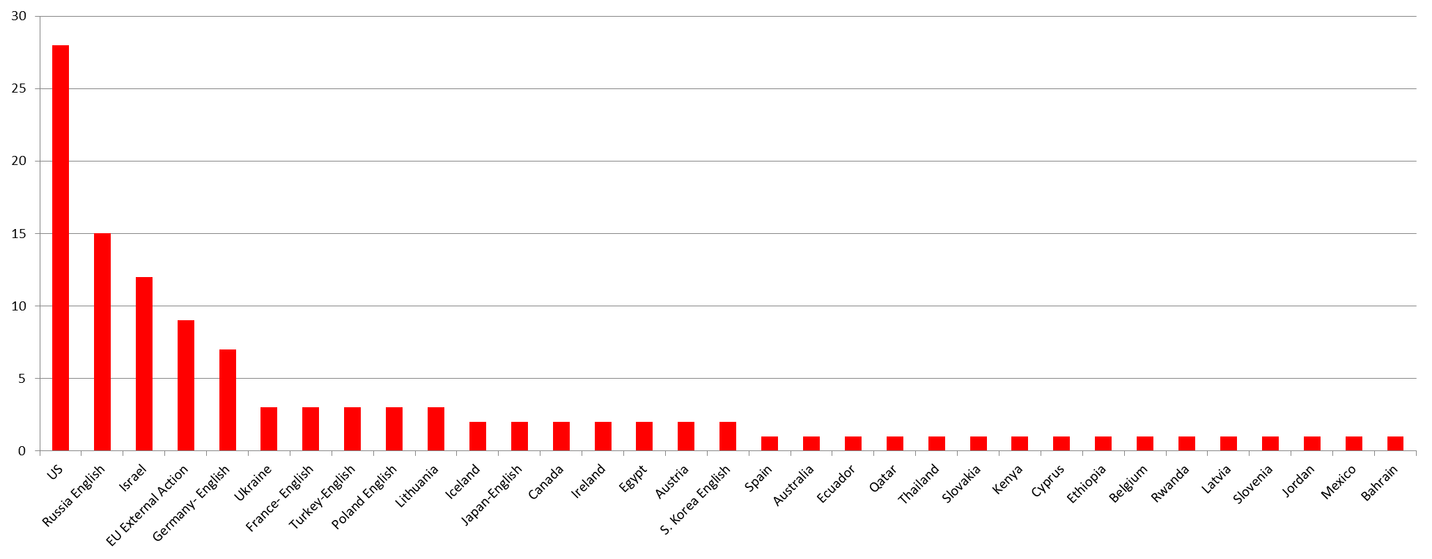 The results of this analysis, shown in the graph below, were surprising to say the least. As can be seen, only 17 MFAs out of the 61 evaluated attracted journalists. Moreover, only the US, Russia, Ukraine, Germany and the EU attracted a considerable amount of journalists (i.e., five or more journalists). 85% of the MFAs evaluated attracted one or no journalists at all.