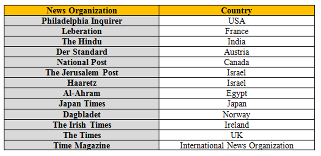 In an attempt to answer my research question, I analyzed the amount of journalists following MFAs and embassies to the UN headquarters in New York on twitter. The journalists evaluated were editors in chief, senior editors, foreign news editors, foreign correspondents and diplomatic correspondents from leading news organizations around the world. The table below identifies the news organizations included in my analysis. The total number of journalists evaluated was 81.