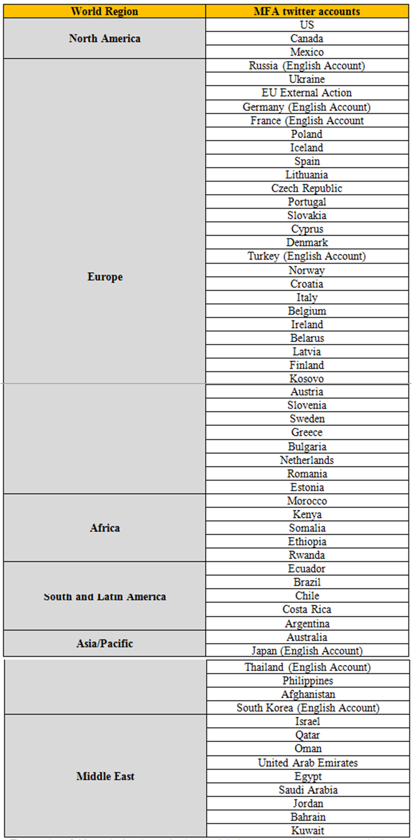 Once I had compiled the sample of journalists, I calculated the amount of journalists following 61 MFAs from around the world. The MFAs examined are listed in the table below.