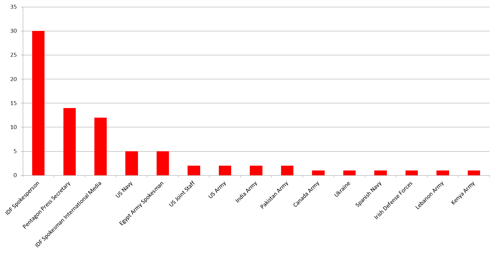 As can be seen, 15 of the 43 militaries evaluated are followed by one or more foreign affairs journalists. This is a rather surprising figure indicating that one third of the armies evaluated are able to attract foreign affairs journalists and editors. However, only the IDF, US Pentagon and Egypt Army Spokesperson seem to attract a substantial amount of foreign affairs journalists. 76% of armies attract one or no journalists at all.