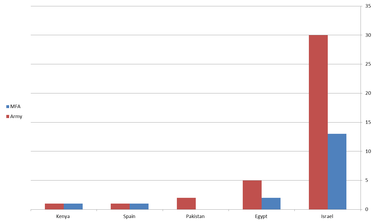 The most surprising result of this analysis came when I compared the number of journalists following MFAs to that following armies. As can be seen in the graph below, in five countries the number of journalists following armies was equal or greater than the number of journalists following MFAs. This gap was most evident in Israel and Egypt’s case case.