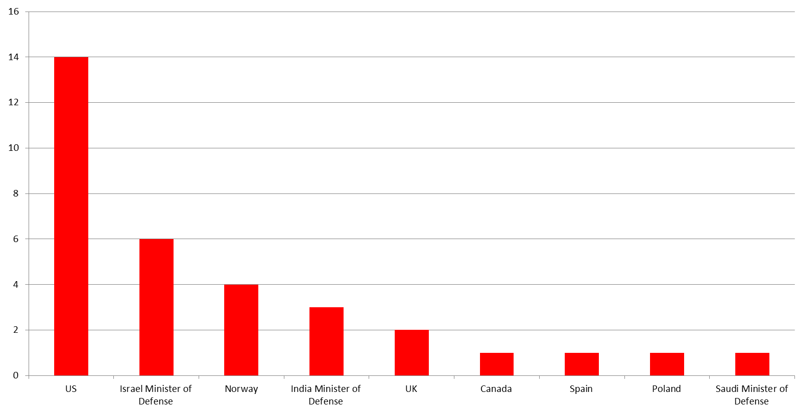 This graph clearly demonstrates that MODs seem to attract less foreign affairs journalists than militaries. Only 9 of the 34 MODs attract any journalist and only the US, Norway and Israel’s Minister of Defense attracts a substantial amount of foreign affairs journalists.