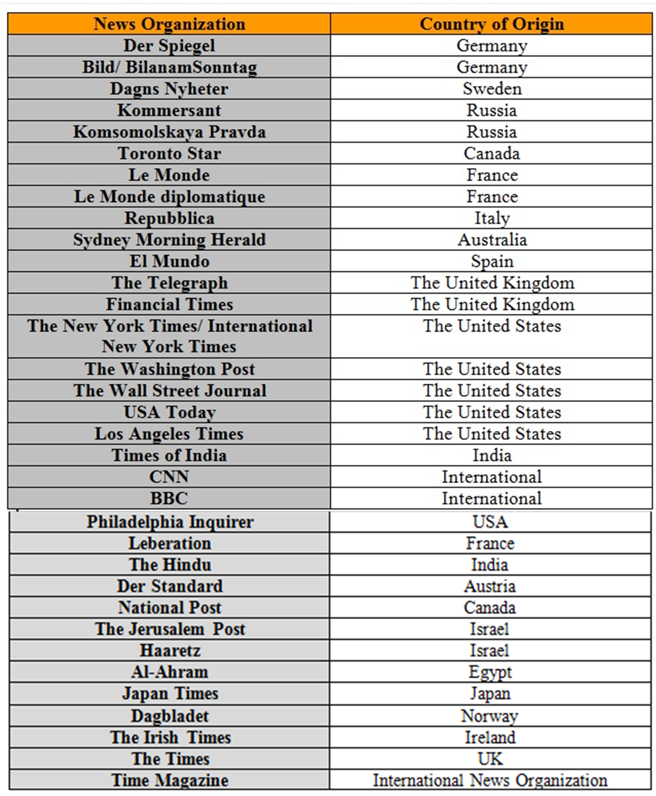 Assessing the degree to which armies are followed by foreign affairs journalists was made possible by compiling a sample of 163 editors in chief, senior editors, foreign news editors and foreign correspondents from leading news organizations around the world. The sample may be viewed in the table below.
