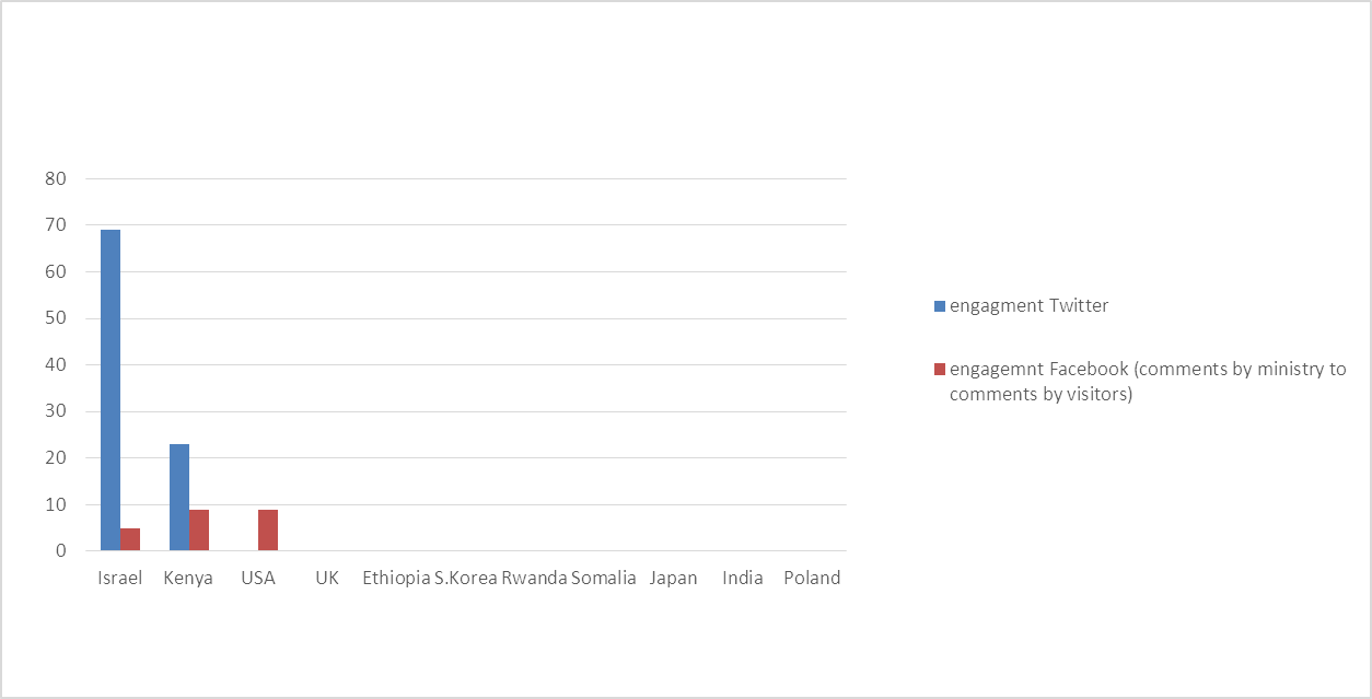 Next, I compared levels of engagement. As a whole, engagement seems to be a rarity among MFAs in this sample with the exclusion of Israel, Kenya and the US. Among MFAs that do practice engagement, Kenya is second only to Israel and exhibits higher levels of engagement than the US State Department.