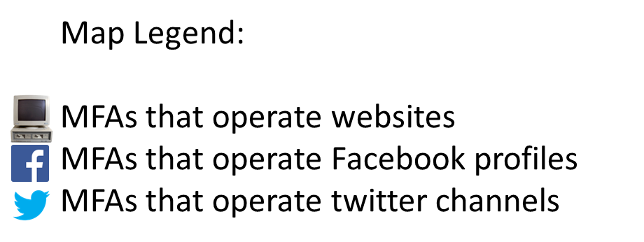 As can be seen in the map above, while Rwanda and Ethiopia have very low internet penetration rates, their MFAs operate websites, Facebook profiles and twitter channels. In fact, there seems to be an increase in the amount of African MFAs that are active on all three platforms as can be seen in the map below.