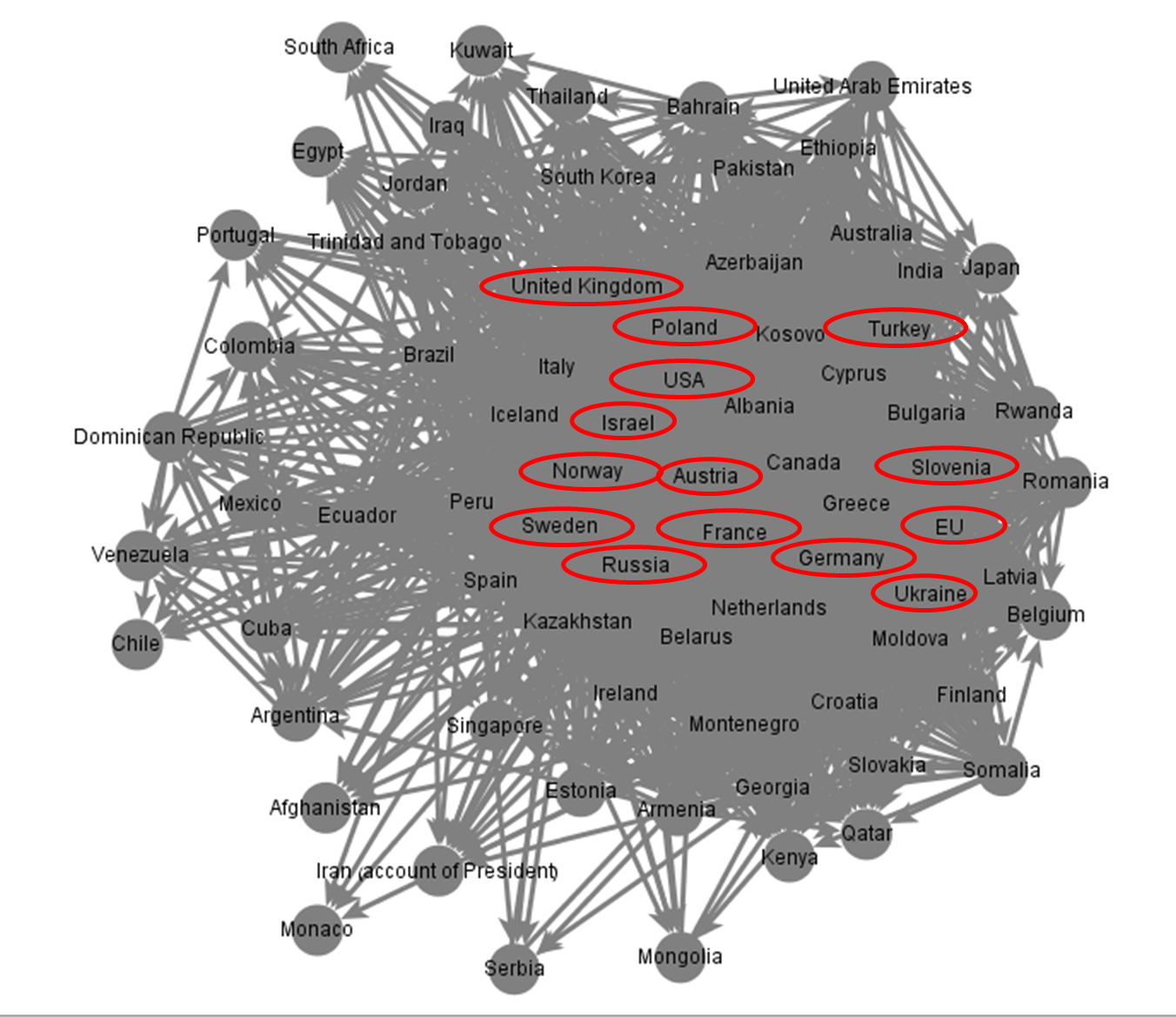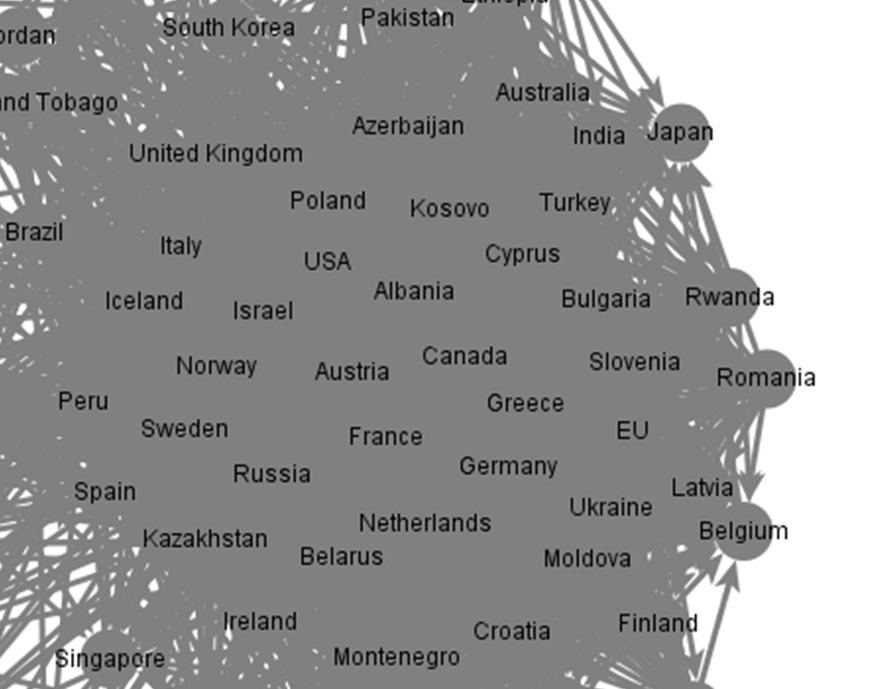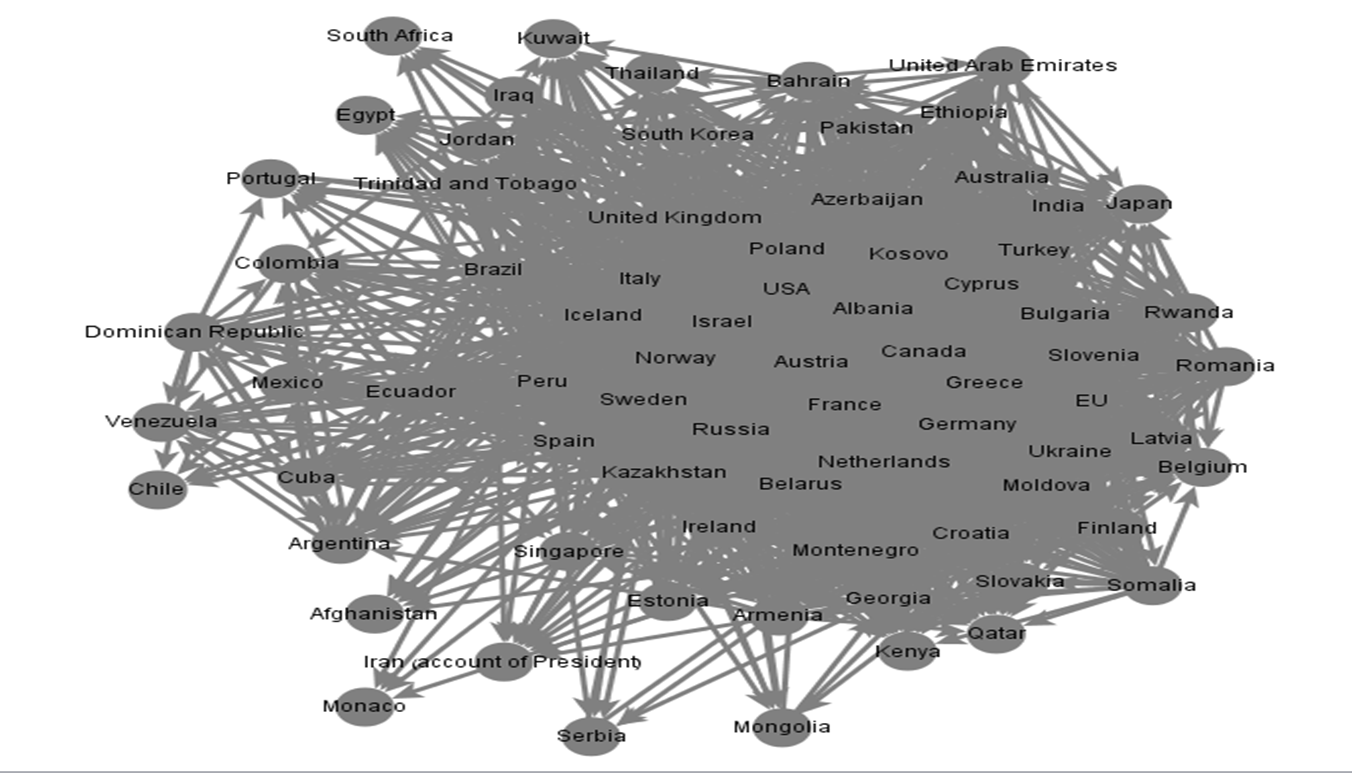 As can be seen in the table above, Norway continues its up-ward climb in this parameter as well and is now the most central hub of information in the entire MFA social network. As opposed to the out-degree parameter, the betweenness parameter shows relatively small changes in ranking. For instance, both the US and Israel which topped this chart last year have dropped four places this year. Interestingly, Russia is one of the only countries to have received similar, if not better, scores in 2015 when compared to 2014. Quite a fete.