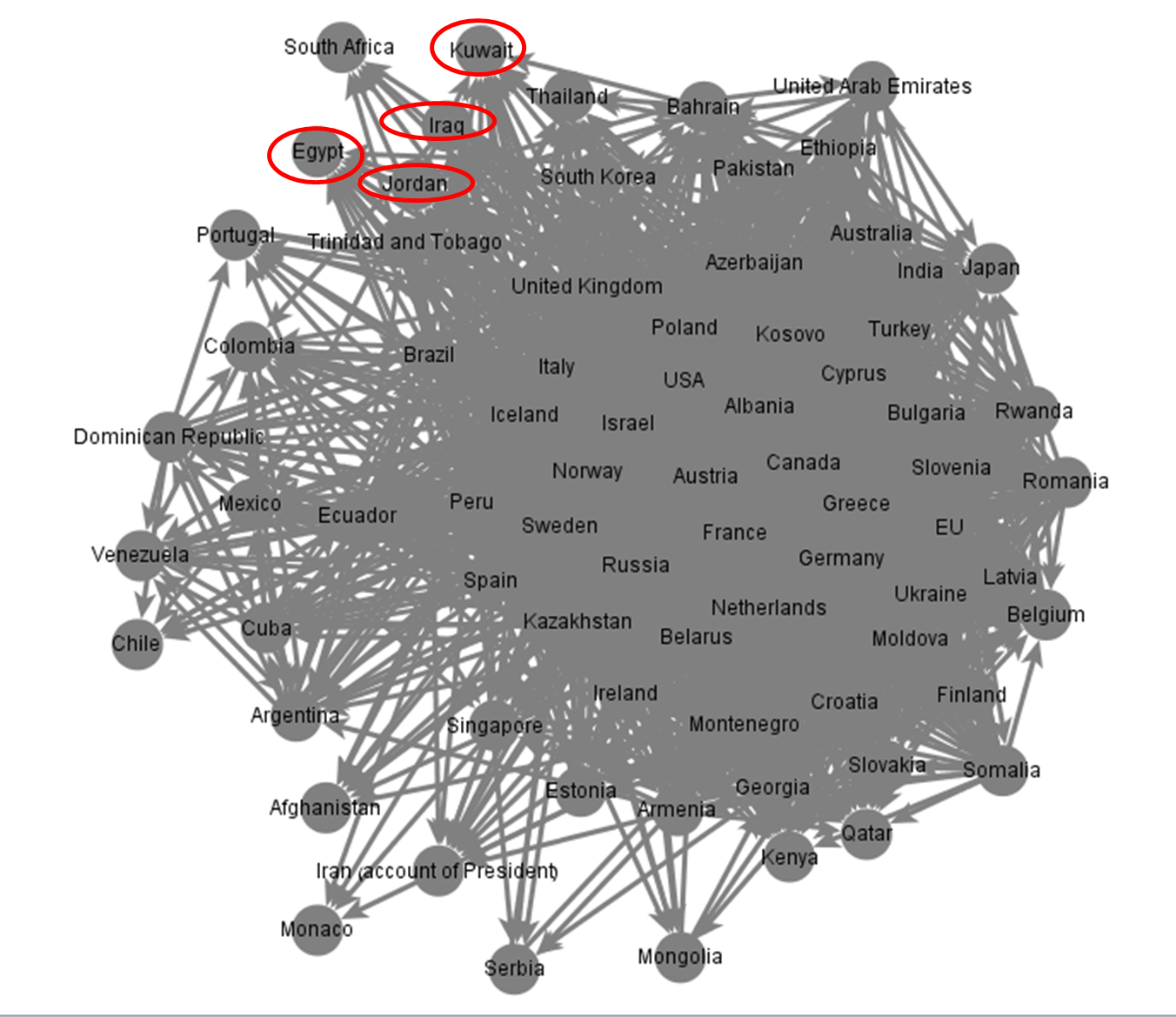 What I discovered was that the world’s MFAs comprise a dense social network as they routinely follow their peers on twitter. I assumed that one MFA would follow another given a desire to gather important information with regard to foreign policy initiatives and agendas. For instance, by following Israel’s MFA, the US State Department can anticipate new Israeli initiatives vis-a-vis the Arab world.