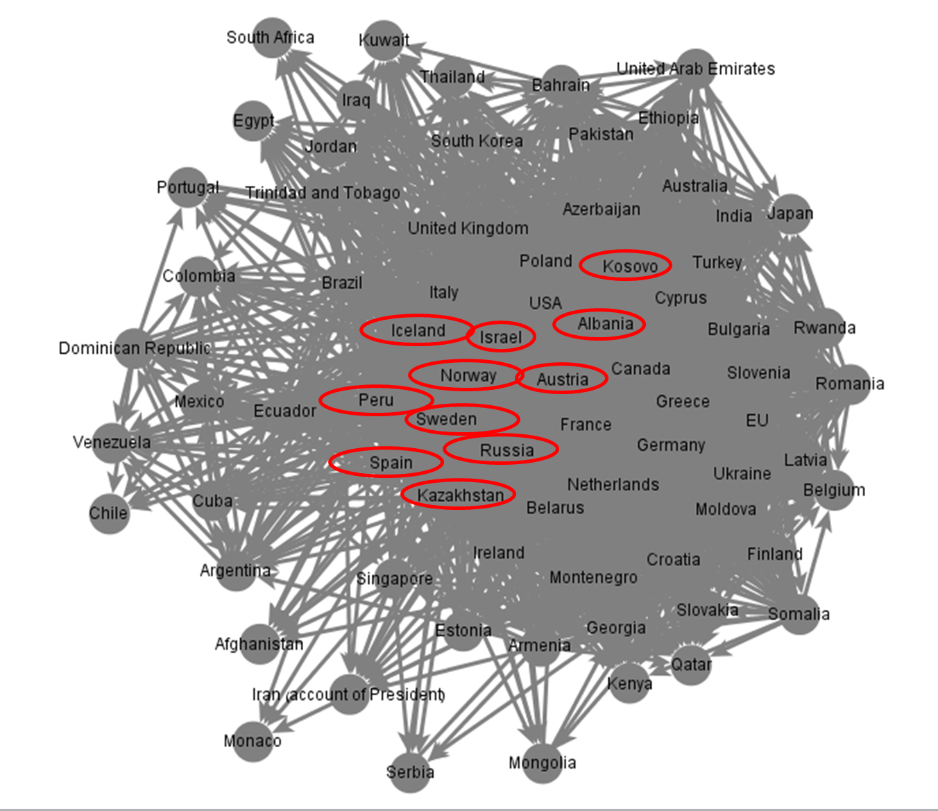 Finally, I calculated the betweenness parameter. This parameter identifies which MFAs serve as important hubs of information as they connect Ministries that do not follow one another directly. The table below presents the 10 MFAs that received the highest betweenness scores. These are also identified in the social network in the image that follows.