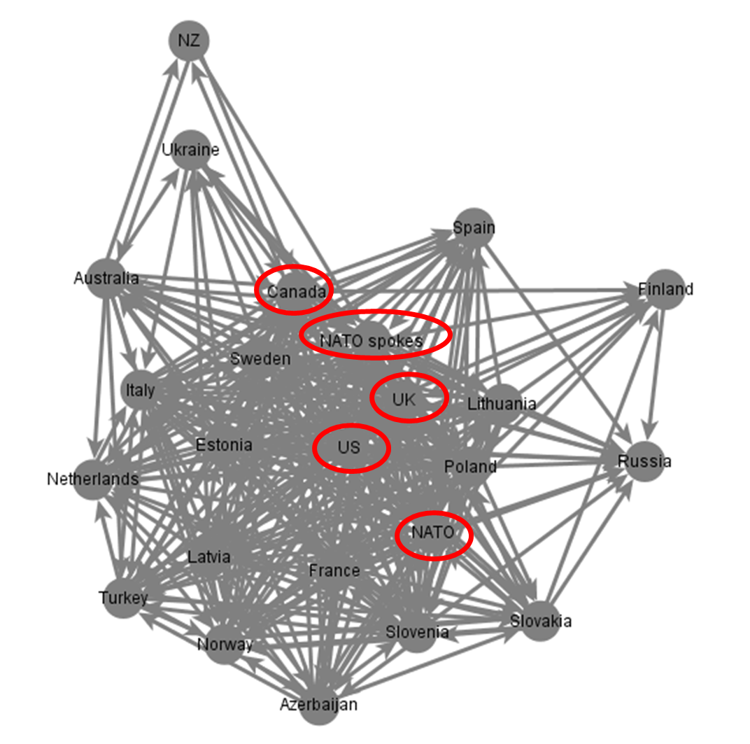 The final parameter, betweenness, calculates which members of the network are major hubs of information as they connect members that do not follow one another directly. As can be seen in the table below, the five accounts with the highest betweenness score were Canada’s mission to NATO, NATO spokesperson, US, UK and Poland.