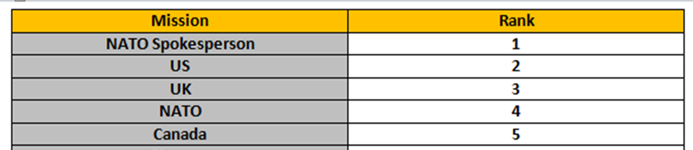 The only three accounts to score high on all three parameters were Canada’s mission to NATO, US mission to NATO and the UK’s mission to NATO.