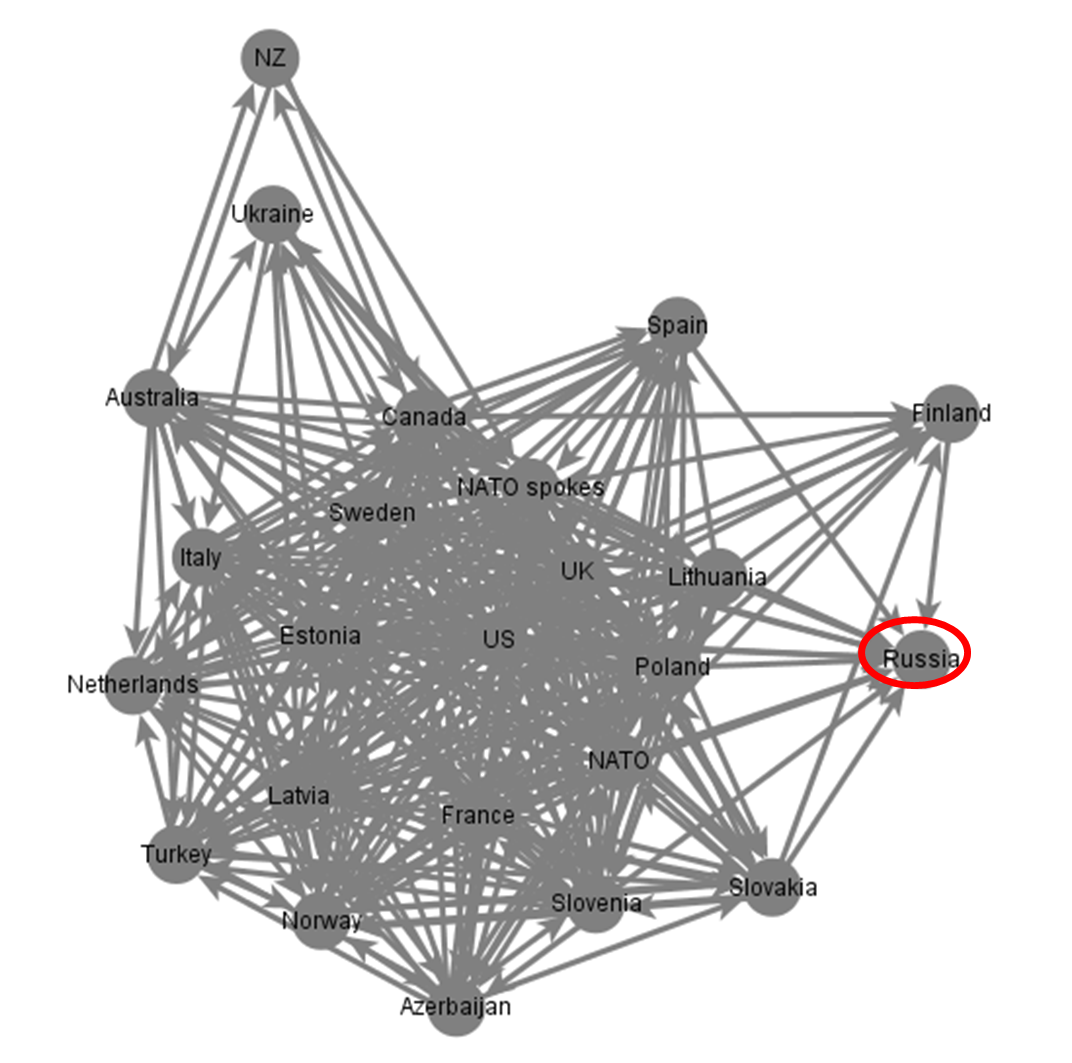 It should be noted that NATO’s spokesperson scored extremely high on both the in-degree parameter and the betweenness parameter. This means that NATO’s spokespersons is able to effectively disseminate information throughout the entire network while also serving as an important information hub linking together mission to NATO that do not follow one another directly.