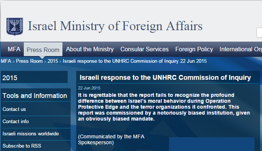 News articles published around the globe included a statement by Israel’s foreign ministry. At that time, the Israeli MFA was the only diplomatic institution to comment on the Gaza report. In a series of tweets published on its twitter channel, the Israeli MFA articulated its arguments against the commission and its main findings.