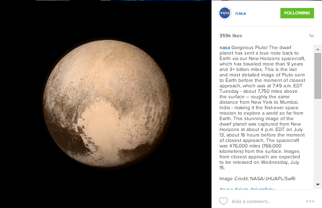 The virtual greeting from Pluto was not the first time NASA has used social media. In fact, the agency has a well-planned social media strategy that includes twitter Q&As, public engagement and continuously updating information from Astronauts, rovers and telescopes. While it already has millions of followers, NASA gained more than 300,000 new Instagram followers immediately after publication of the Pluto picture (present company included).