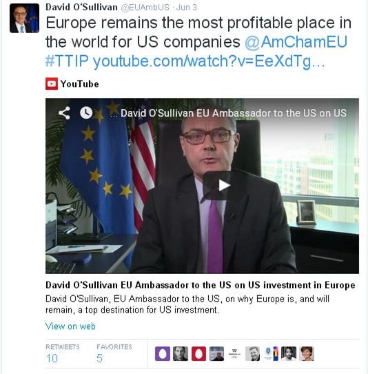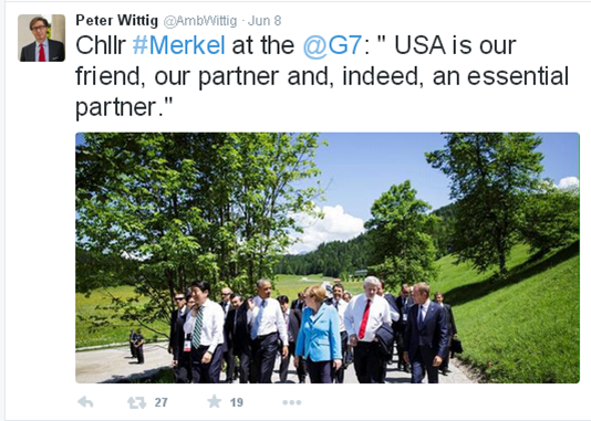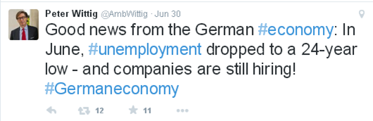 Similar tweets were published by the EU’s and Germany’s ambassadors to the US. I do however find myself wondering if such tweets are especially relevant in the US given that its main business- is business. If this is indeed the case, then such tweets are actually tailored to the local culture thus explaining their appeal.