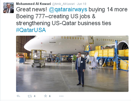 The Business of the US is business- Tweets dealing with trade agreements, employment rates and financial markets are relevant to any audience any time. Many of the ambassadors’ tweets that comprise this theme place an emphasis on how financial relations serve both nations. This is best exemplified by the tweet below published by the Qatari ambassador boasting his country’s contribution to US employment.