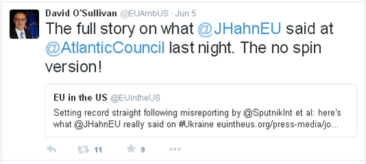 Such tweets may be appealing to followers as they offer the promise of a “no spin” version of events. This is exactly the promise made by the EU’s ambassador to the US in the tweet below.