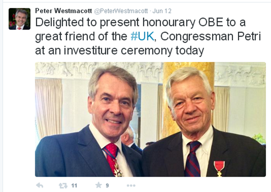 Framing the nation-Tweets belonging to this theme were those in which ambassadors highlighted certain aspects of their countries in an attempt to manage their nations’ brands. As framing is a result of selection and emphasis, one may also frame his own country. Such is the case with the tweet below in which the UK’s ambassador has knighted a former US member of Congress. This tweet highlights the uniqueness of British culture, heritage and tradition.