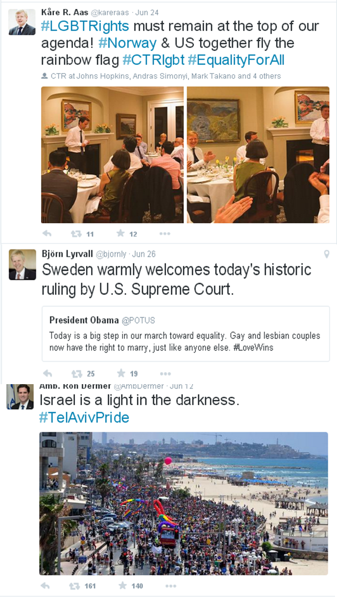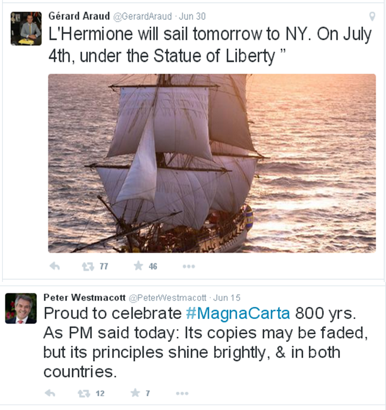 Shared values- This theme includes tweets in which ambassadors highlight the values their country shares with the US. These tweets may be appealing to social media followers as they make bi-lateral relations more tangible. They offer an answer to the question- why are France and the US such close allies? The answer stems from the two countries’ shared values, norms, beliefs and even history. Interestingly, ambassadors’ tweets that dealt with shared values were always timely. Such was the case with a French tweet ahead of the US 4th of July celebrations, the anniversary of the Magna Carat and British democracy or tweets about LGBT rights following the US Supreme Court ruling. Theses tweets indicate that some ambassadors have indeed mastered the art of Twiplomacy which is all about timing.