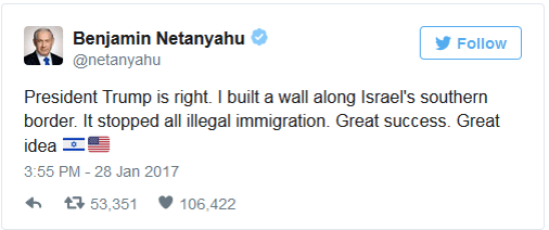 The second part of the tweet, “Great success. Great idea ” was intended for foreign audiences. It is this part of the tweet that aligns Israel with US President Trump and with his immigration policies. As such, the PM used this tweet to announce an important component of Israeli foreign policy- Israel stands shoulder to shoulder with the US on issues relating to immigration.