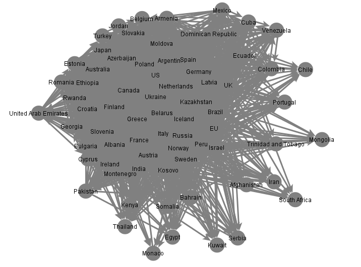 In May of 2014, I published my analysis of the social network of world foreign ministries (MFAs) on Twitter. My assumption was that MFAs would actively follow one another online in order to gather relevant information. For instance, by following other ministries an MFA may be able to identify policy changes in certain countries, anticipate new foreign policy initiatives and predict possible crises. Moreover, if an MFA is followed by many of its peers online it may be able to disseminate information throughout the entire diplomatic milieu with the click of a button. Even more importantly, an MFA would be able to frame, or narrate, its own policy initiatives.