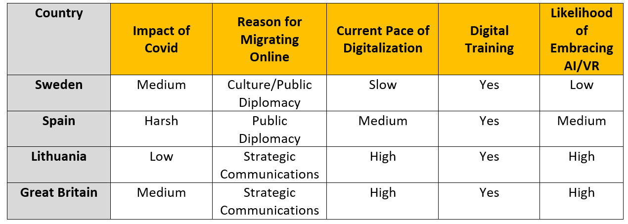 Table 1 suggests that the national impact of Covid may determine diplomats’ investment in the next wave of technologies. Indeed, Italy, Spain and others who lost tens of thousands of citizens may realize the need for digital diplomatic infrastructure (e.g., virtual reality helmets). Next, an MFA’s motivation for migrating online may also be important. Those MFAS that simply wish to brand their nation will be late adopters of such technologies. However, the most important factors are Current Pace of Digitalization and Digital Training. Those MFAs that have become accustomed to embracing new technologies, and to implementing such technologies through digital training, will be most likely to prepare for the future ‘Covids’.