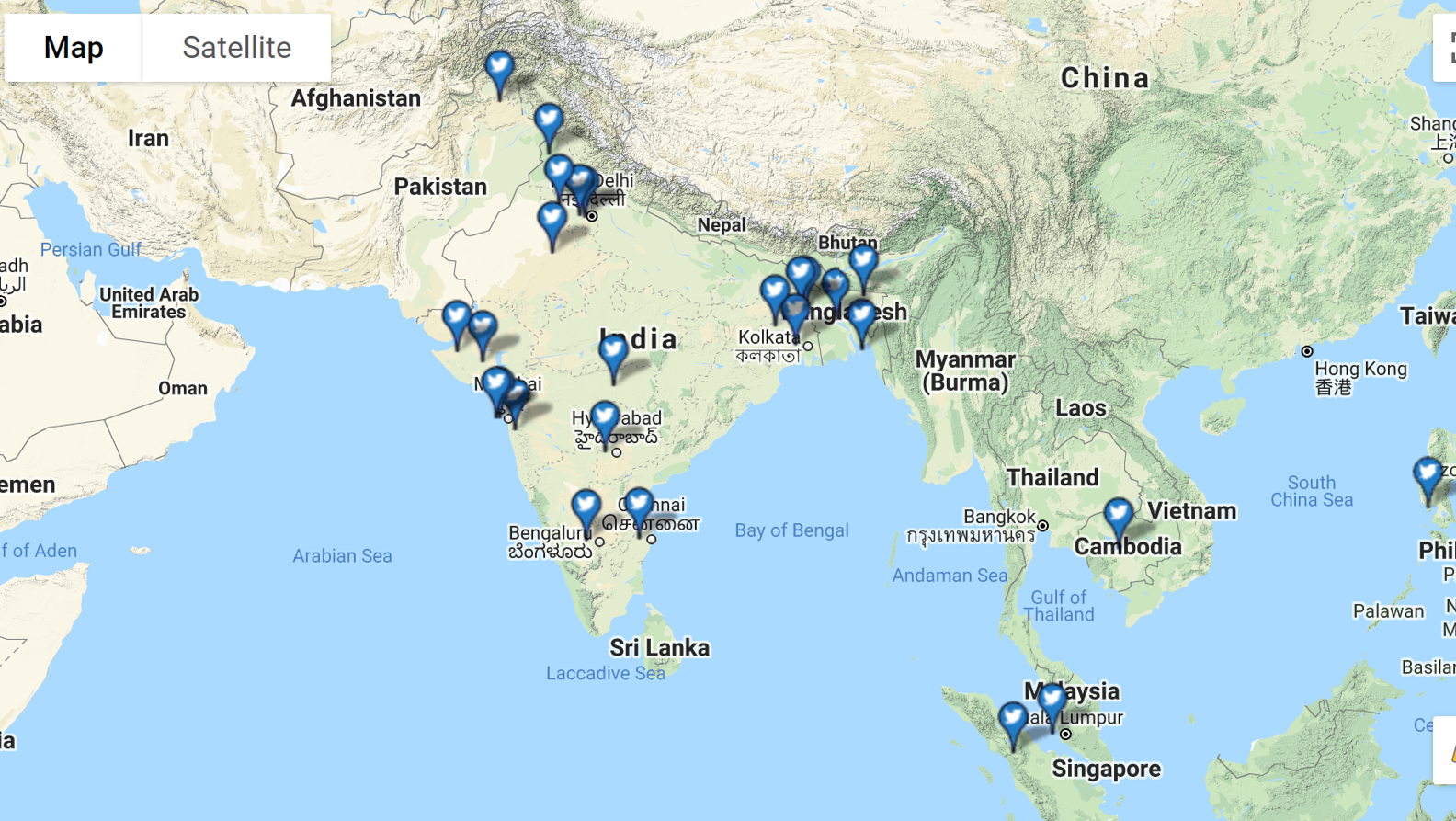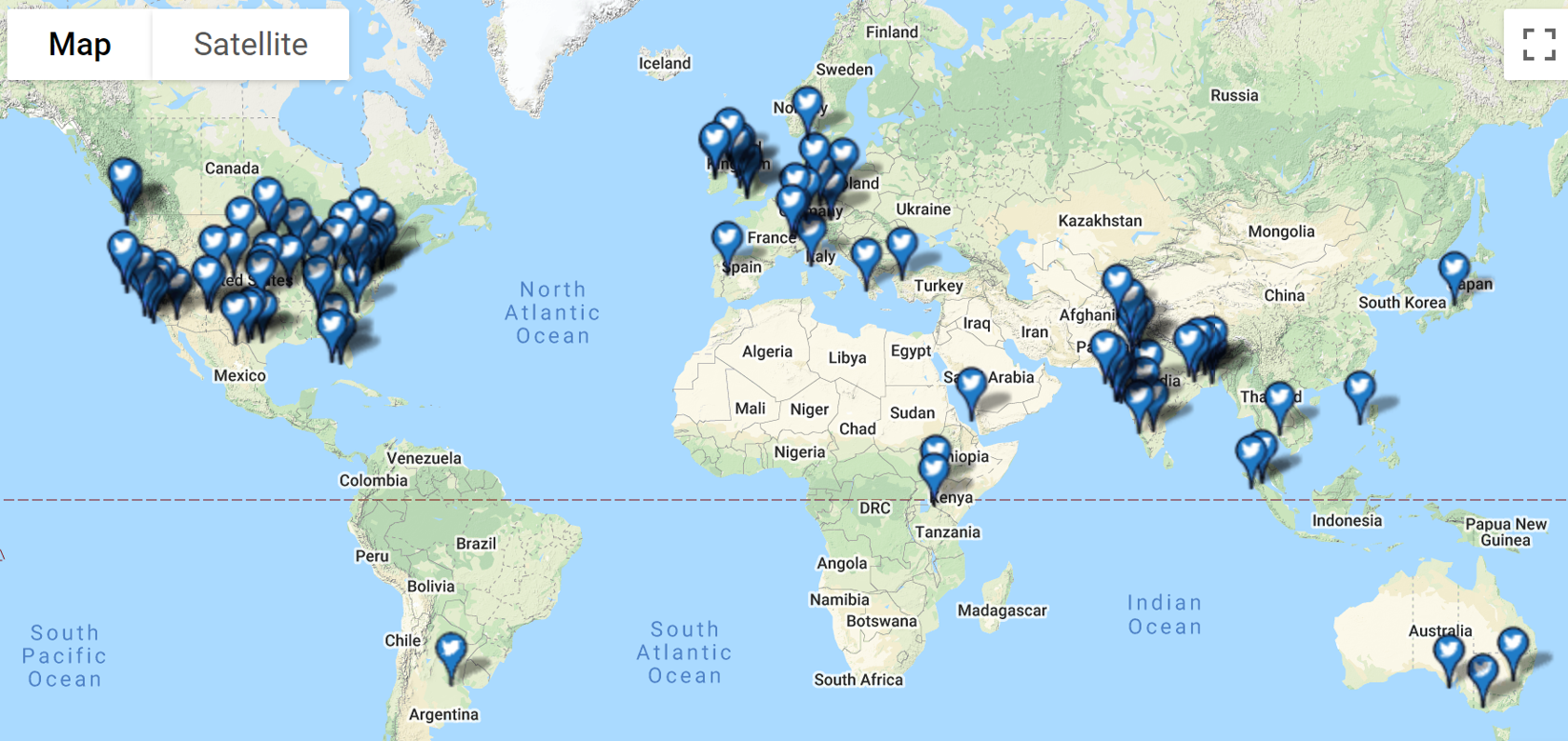 The second cluster includes journalists. Notably, the Ambassador has attracted a global media following including, but not limited to the Israeli press. Influential Arab papers published both in the region and abroad follow the Ambassador as do US new agencies such as CNN and Forbes. Other journalists hail from as far as Canada and Eastern Europe. As the following images below demonstrate, the Ambassador’s current following is global in nature as he has Twitter follower hubs in the US, Western Europe, India and South-East Asia. It is possible that all such followers are eager to see what warm bi-lateral ties between Israel and an Arab State may look like.