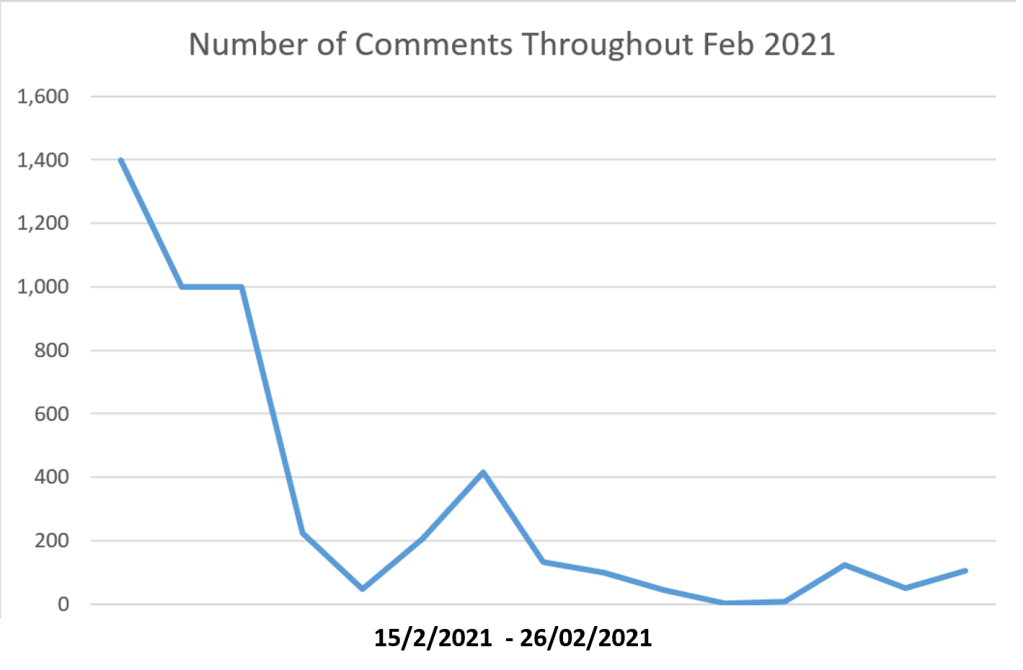 To summarize, the UAE Ambassador has made an excellent first, digital impression attracting the gaze of average Israelis, policy makers, journalists and a global audience. However, the Ambassador cannot afford to rest on his laurels. As the graph below demonstrates, the number of comments garnered by the Ambassador’s tweets had declined sharply over the past two weeks. While these comments remain positive, they may suggest that followers wish to learn from the Ambassador about actual policy priorities and policy collaborations, rather than continuous calls for peace and understanding.