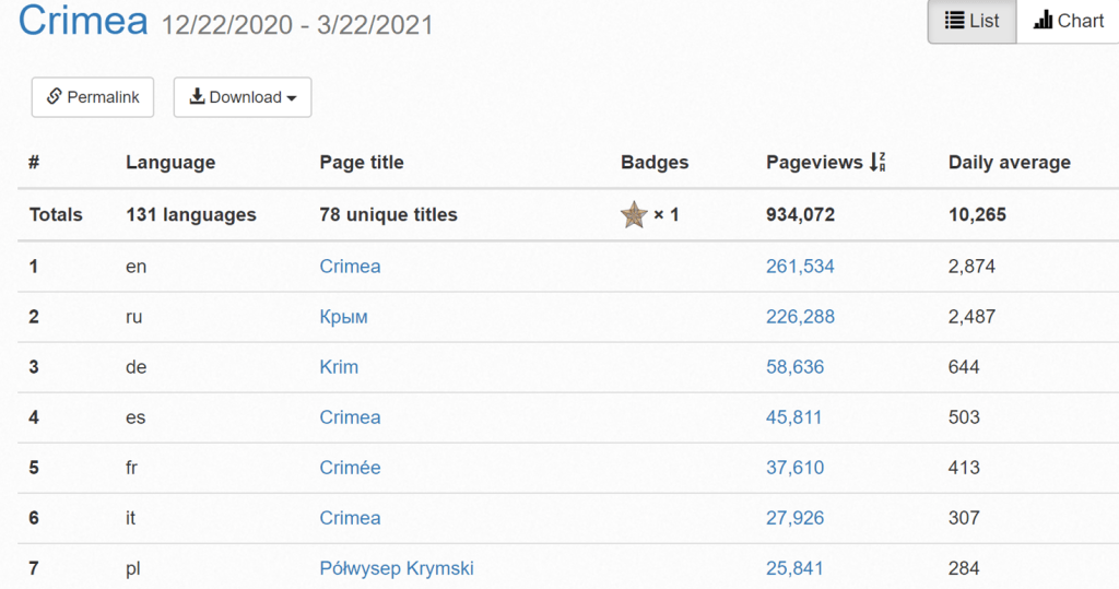 The table below records the number of Wikipedia users who have read the article on Crimea over the past 90 days (source: pageviews.toolforge.org). As can be seen, tens of thousands of users have learned about Crimea from non-English entries including those authored in Russian, German, French and Polish. As these articles are less likely to be reviewed by Wikipedia editors, they may be riddled with inaccuracies, falsities and lies.