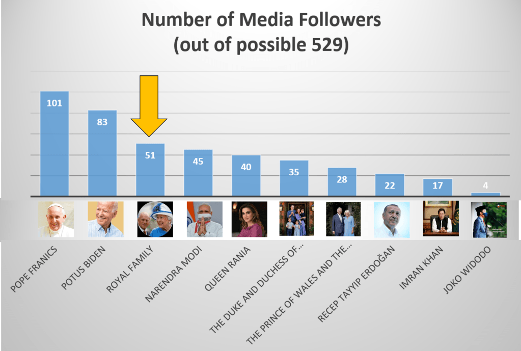Yet not all is lost. When examining which world leaders attract the most journalists and news organizations, the Queen ranks third after President Biden and Pope Francis.