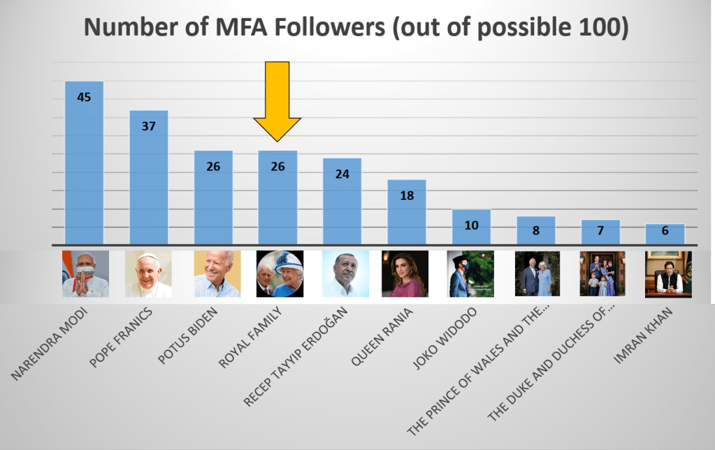 When examining diplomats, I also found that the Queen and the Royal Family surpass many world leaders. The Queen is the third most followed world leader among foreign ministries (sample of 100 MFAs on Twitter), and the fourth among Ambassadors (sample of 950 Ambassadors on Twitter). Diplomats may follow the Royal Family as Royal statements can serve as diplomatic signals sent on behalf of the British government. In such instances, the Queen becomes a spokesperson and a unique one at that given the integrity and respect afforded to her station.