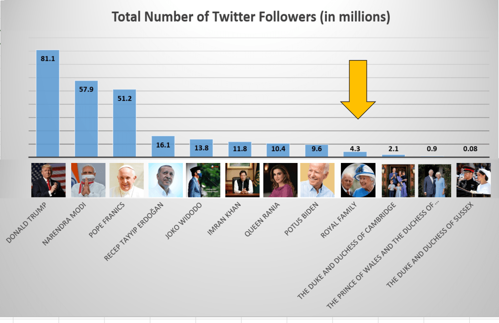 Yet the Royal Family seems to have failed to adapt to the digital age. Unlike world leaders, that attract tens of millions of social media followers, Royal accounts arouse little interest. An analysis of the popularity of world leaders on Twitter, shown in the graph below, demonstrates that the Queen lags behinds all her peers. While Donald Trump attracted some 80 million Twitter users, and Pope Francis boasts a following of 51 million Twitter users, Queen Elizabeth and the Royal Family settle for a meager 4 million users. The heir (Prince Charles) and the spare (Prince William) are the least followed of all evaluated world leaders.