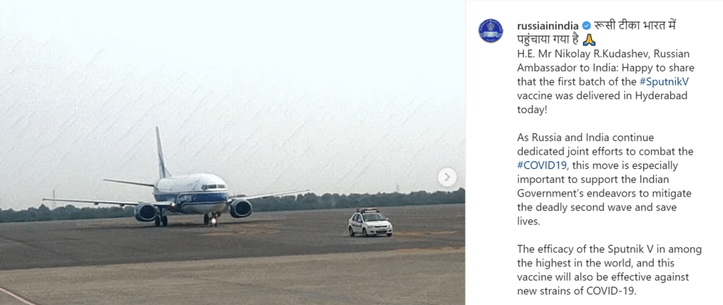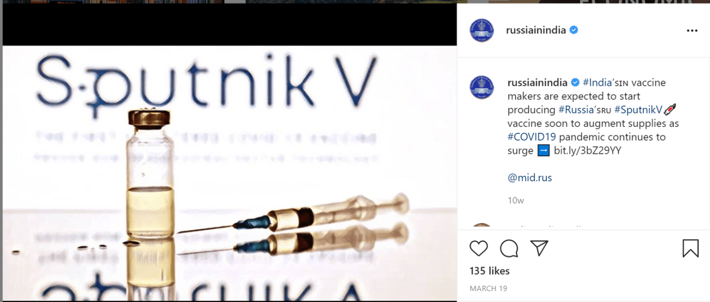 To assess the bi-lateral ties between Russia and India, I decided to analyze Covid-related images shared on Instagram by the Russia Embassy to New Delhi. My analysis found that the Russian Embassy posts three types of images. The first, focus on the efficacy of the Sputnik V vaccine. One image seemed to resonate with adverts of pharmaceutical companies. A sterile image, it presented the Sputnik V vaccine as a scientifically valid antidote to the Coronavirus.