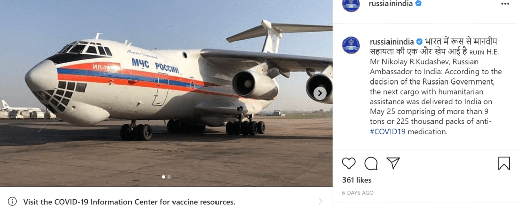 One video posted on Instagram depicted a Russian plane landing in India and then took audiences into the belly of the plane showcasing the vast amount of vaccines sent by Russia. Here again the language is important as Russia called for shared or collective action to meet a shared challenge- the Covid outbreak.