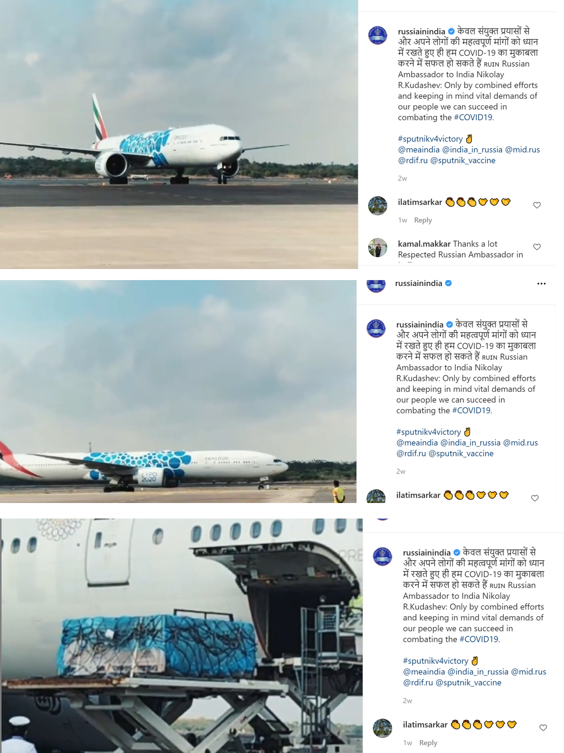 A third type of images documented Russia’s foreign aid to India in the wake of the pandemic. As has been the case with other MFAs and Embassies, these images tended to include large airplanes arriving at India filled with oxygen, ventilators and Covid vaccines. It is important to note the language used by Russian diplomats who insisted that these planes were a form of ‘humanitarian aid’ and not mere foreign aid. This term is important as it echoes messages on other Russian digital channels which portray the Sputnik V vaccine as Russia’s gift to humanity.