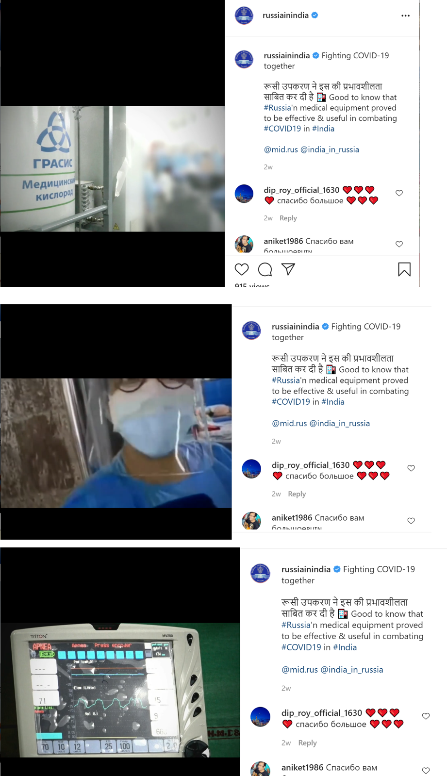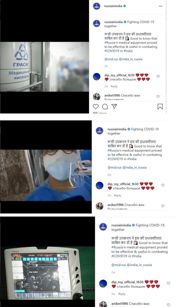 A second video argued that Russia’s medical equipment ‘proved effective and useful’ in combating Covid in India. This video played an evidentiary purpose documenting the medical equipment provided by Russia. To this end, the video included an interview with an Indian doctor who specified how the Russian equipment helped save lives in India.